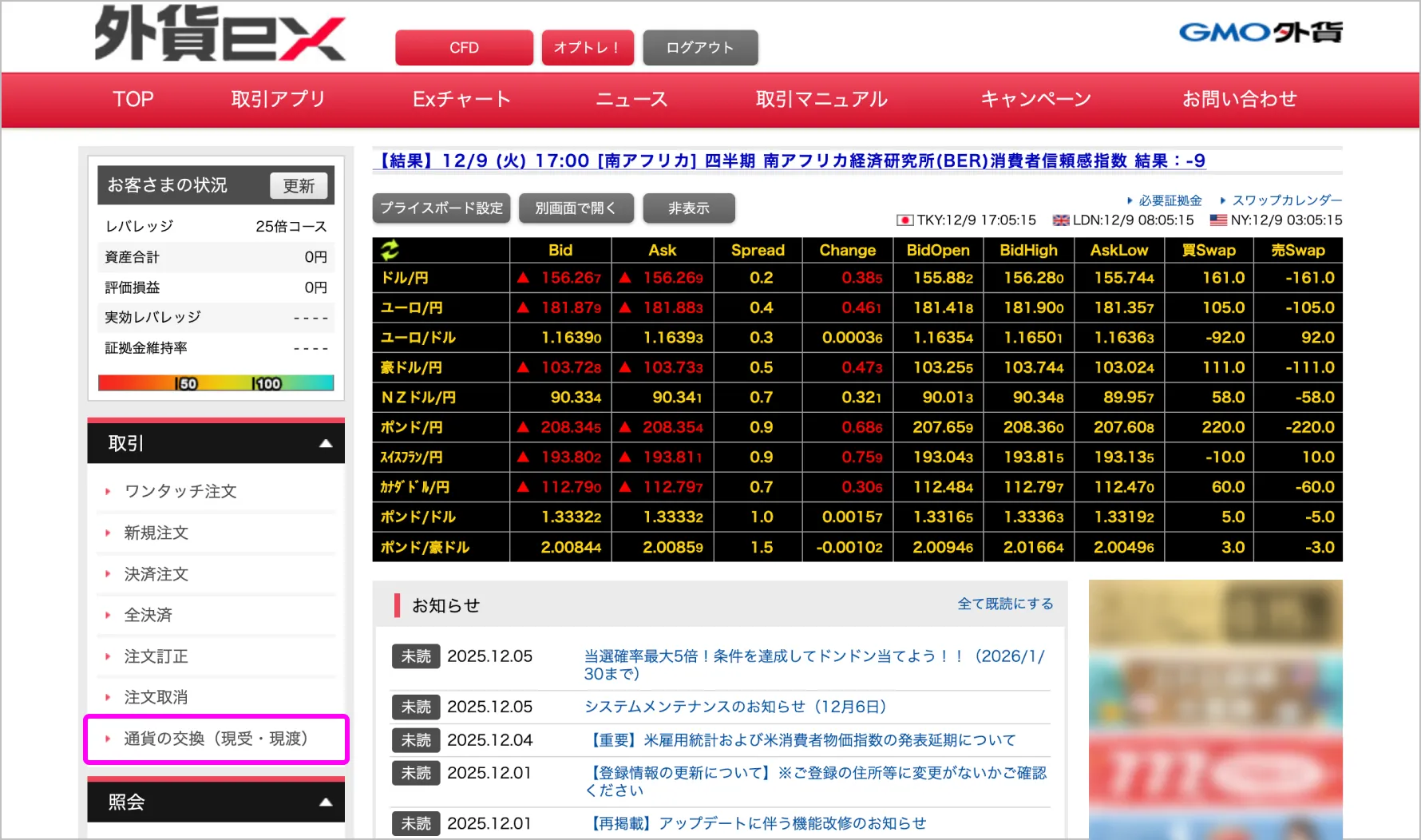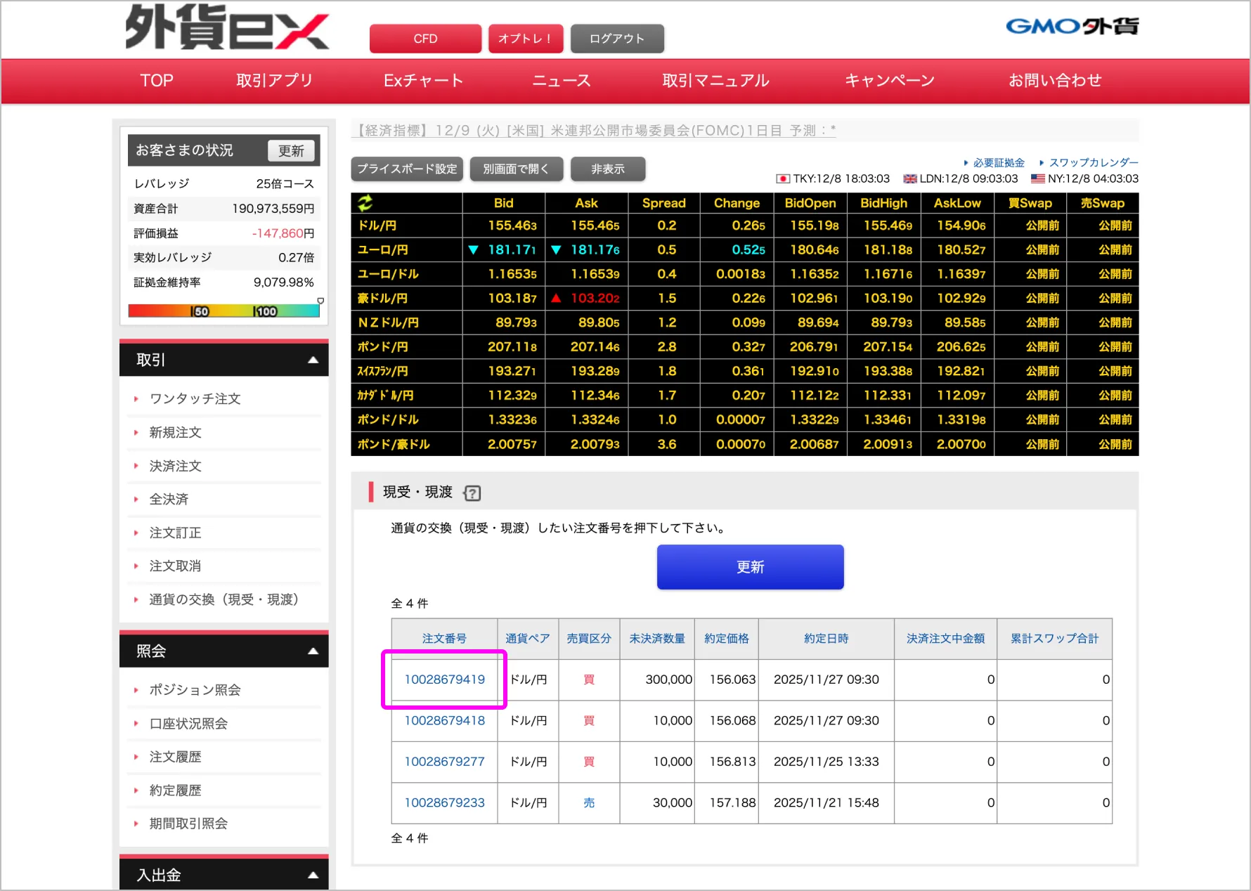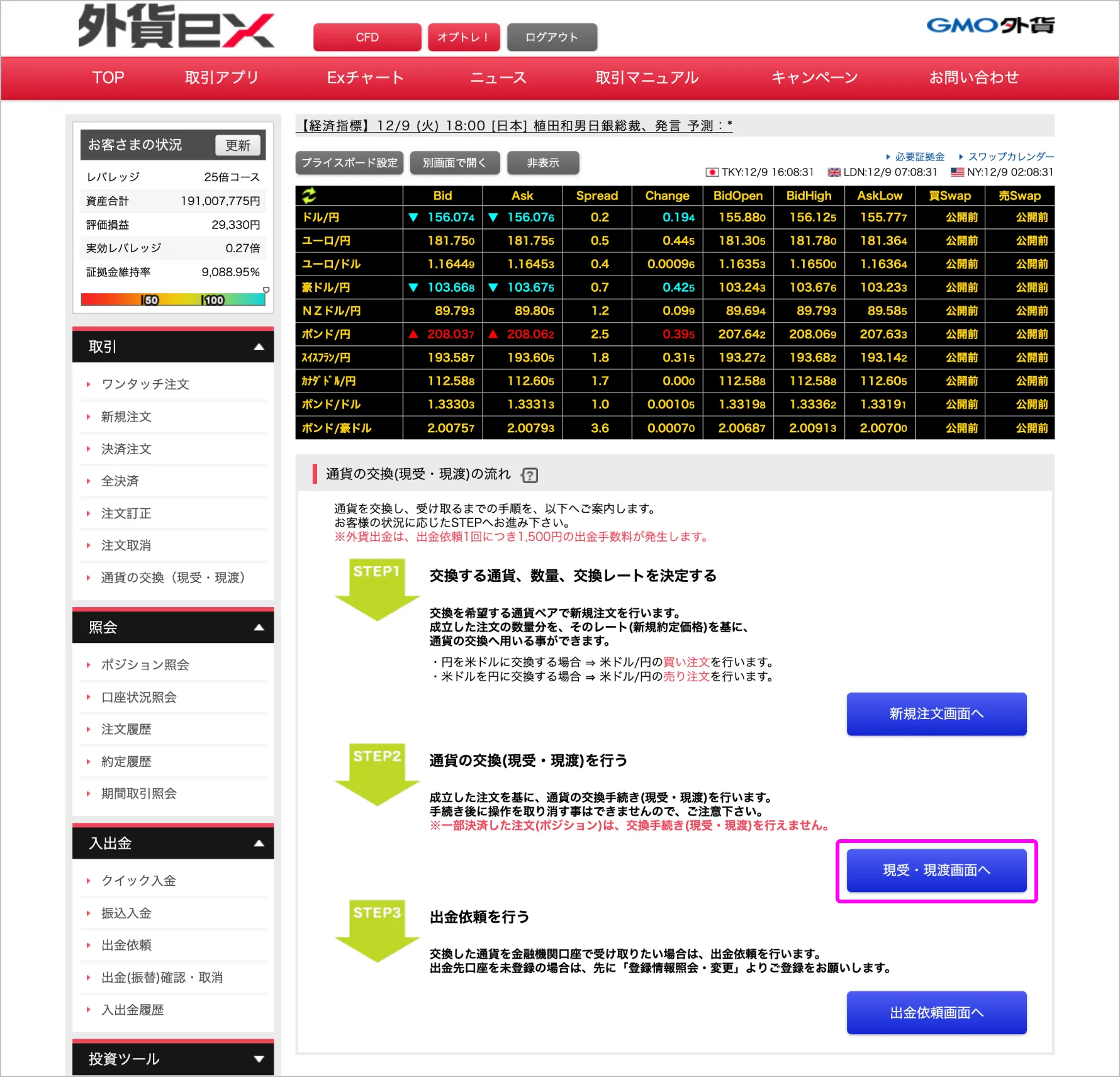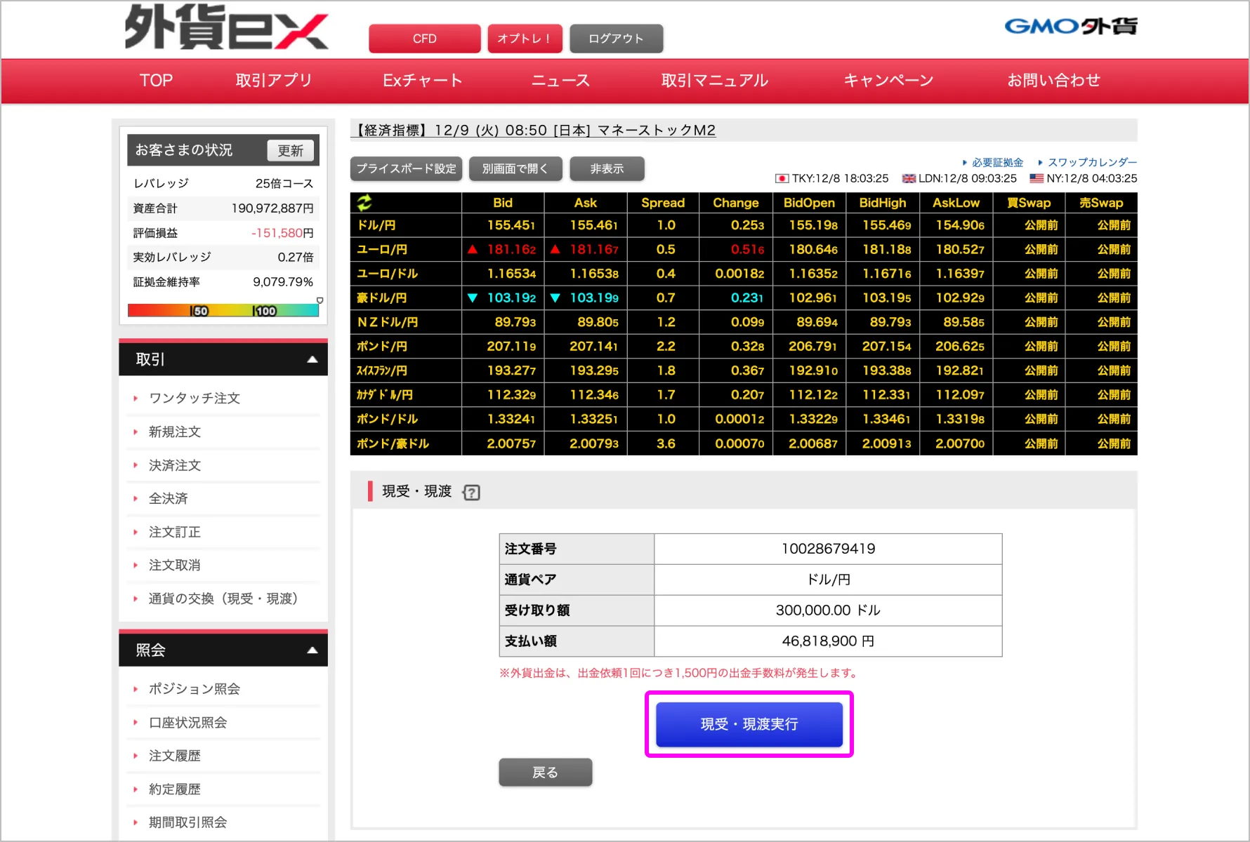 取引メニューの「通貨の交換(現受・現渡)」を選択します。