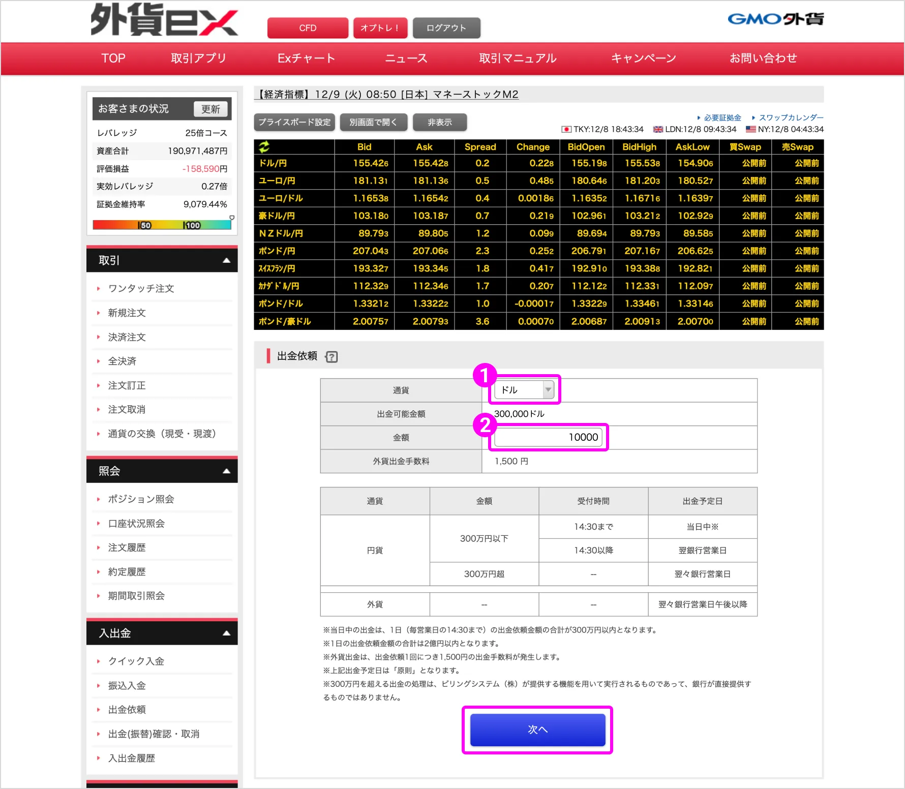 出金したい通貨と金額を設定し、「次へ」ボタンをクリックします。