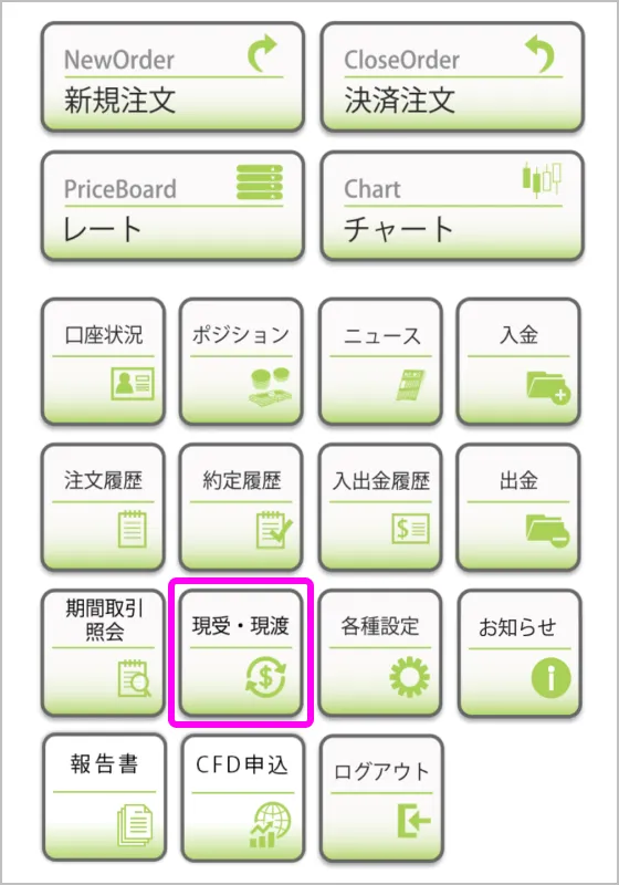 メニュー画面で「現受・現渡」を選択します。