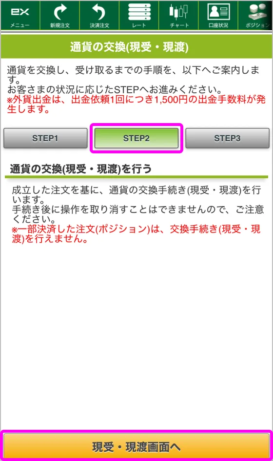 「STEP2」ボタンをタップし、「現受・現渡画面へ」ボタンをタップします。