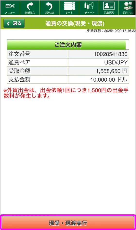 内容を確認し間違いがなければ、「現受・現渡実行」ボタンをタップします。