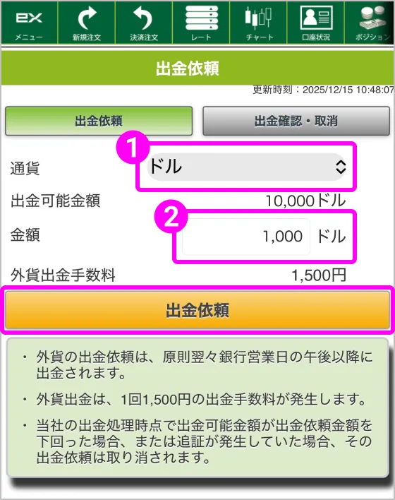 ❶ 出金したい通貨を選択