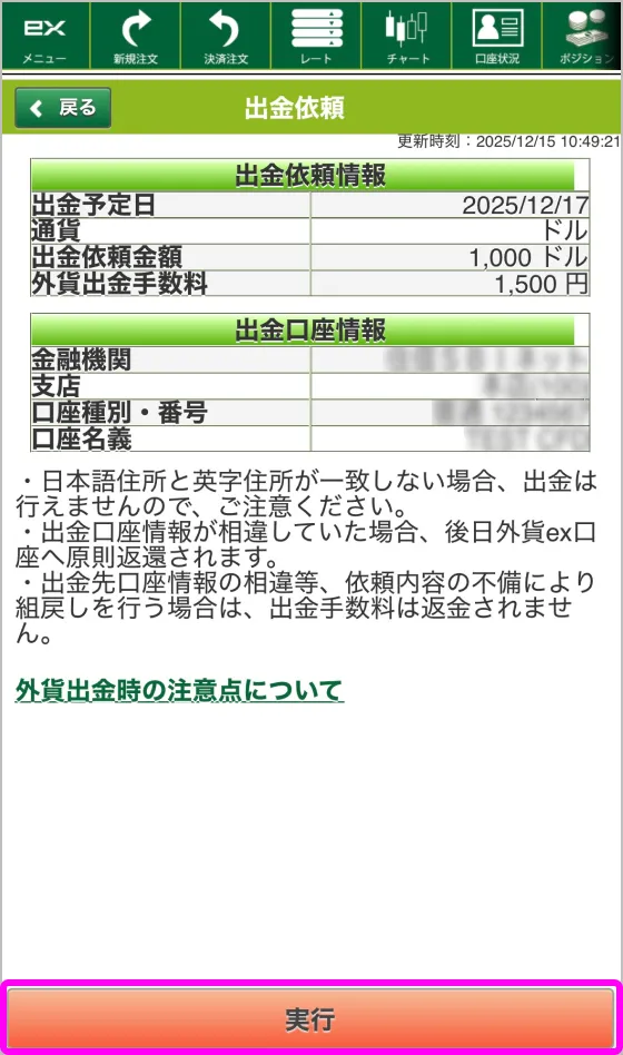 内容に間違いがなければ「出金依頼実行」ボタンをタップします。