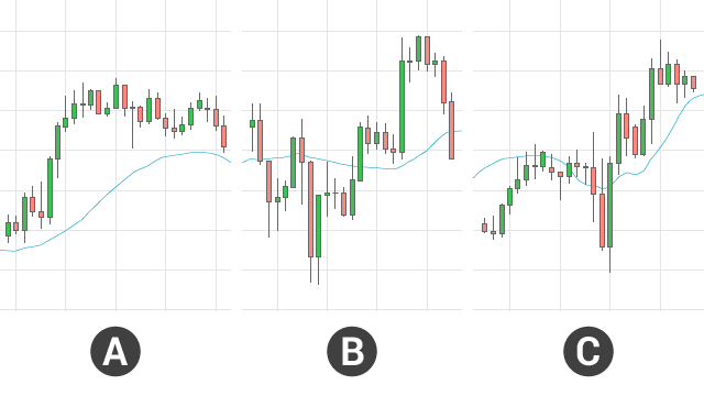 上昇トレンド中の移動平均線への接近は、押し目買いポイントのひとつです。移動平均線だけを見ると、どのチャートも一見上昇トレンドのように見えますが、直近のローソクの長さや位置、最新(一番右の)の移動平均線の向きなども合わせて読み取ると、トレンドの強さや反発の可能性が高いタイミングが見えてきます。