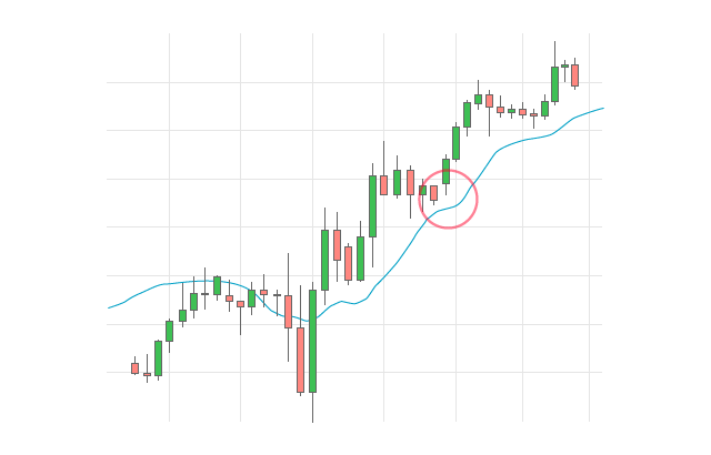 丸印の位置で、価格が移動平均線に近づいています。このまま移動平均線を割り込む可能性も考えられますが、移動平均線が上向きなので、反発する可能性も十分に高いと考えられます。このポイントは「押し目買い」と呼ばれるトレード手法でのエントリーチャンス。押し目とは、上昇途中にある価格が一時的に下げ止まるポイントを指します。逆に売る場合は、「戻り売り」といって、これは下降トレンド時、一時的に上げ止まるポインドで売る手法です。この手法は初心者からトレーダー上級者まで、幅広く使われるトレード法です。