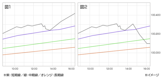 下図では短期、中期、長期の3つの移動平均線がそろって上昇中です。そして、下降してきた足が短期線に接触して反発したところです。これを買いサインと捉えた場合、図1のように、そのまま反発が続いた場合は、買いサインが有効だったことになります。一方で、図2のように、反発が続かず下落に転じてしまう場合もあります。その場合は結果「だまし」だったことになります。