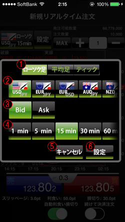 チャート設定にて選択した内容を取り消して、リアルタイム注文チャート画面へ戻ります。