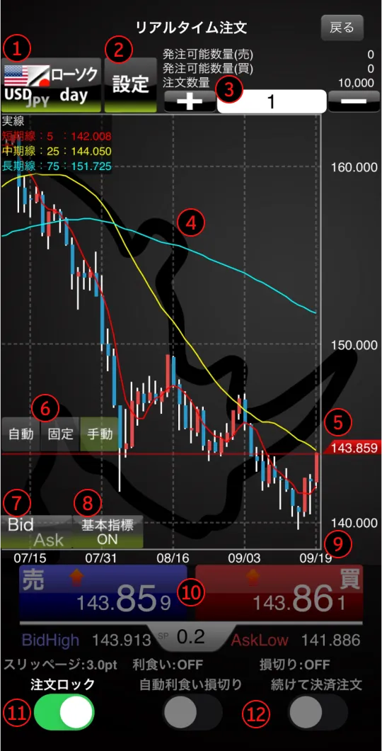 現在設定中のスリッページと自動利食い損切りの情報が表示され、利食いと損切りのオンとオフを切り替えることができます。