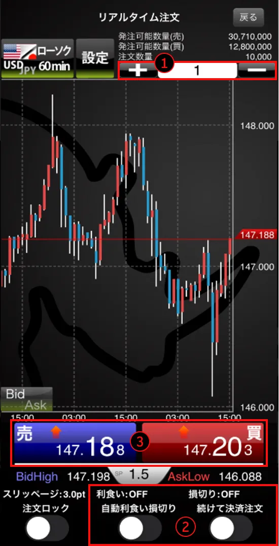 ②自動利食い損切りを同時に注文する場合はオンにし、利食い損切りポイントに誤りがないか確認してください。