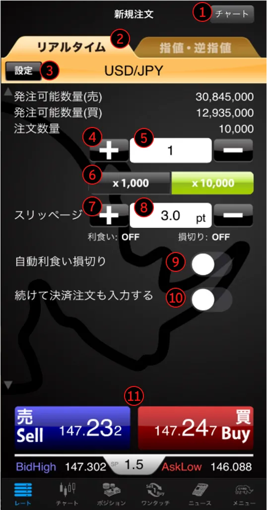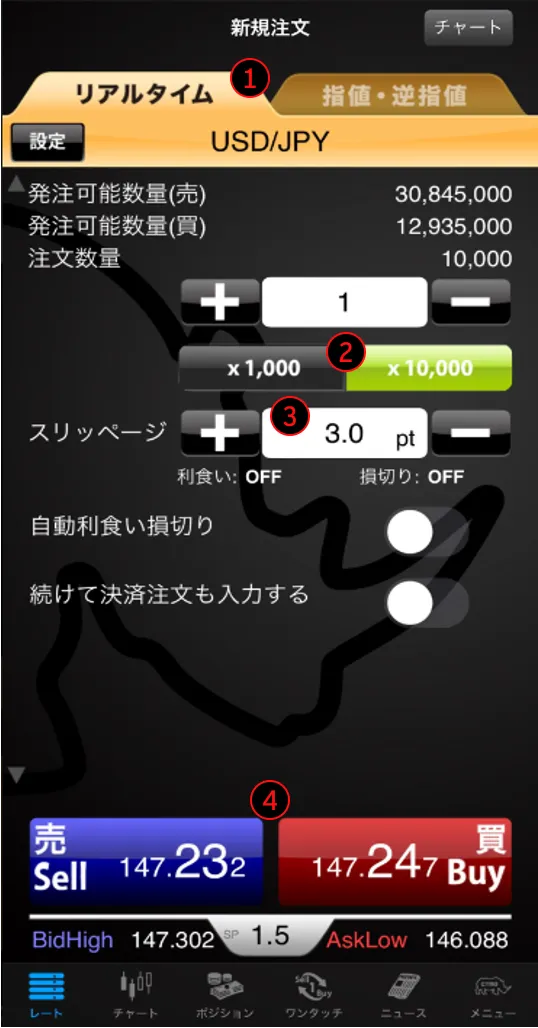 売/買ボタンをタップすると新規リアルタイム注文画面で入力した内容で発注します。