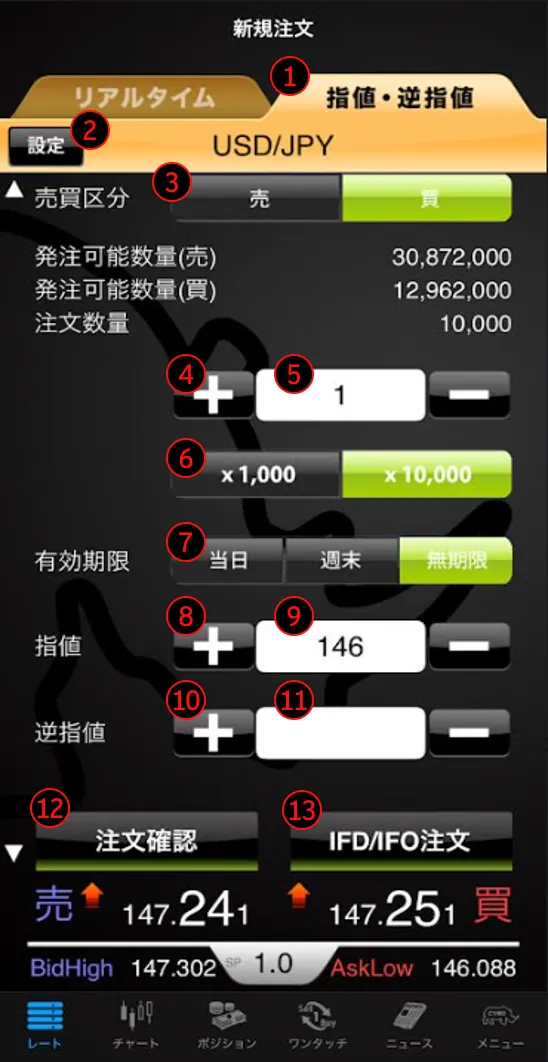タップすると、新規指値・逆指値注文画面で入力した内容で発注します。