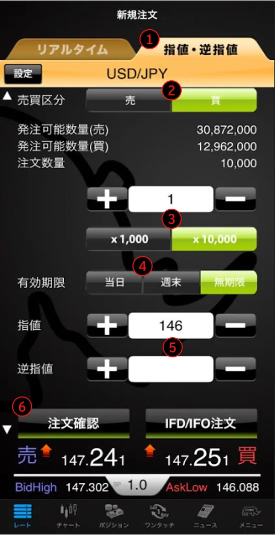 ⑤「指値」または「逆指値」に希望のレートを入力します。