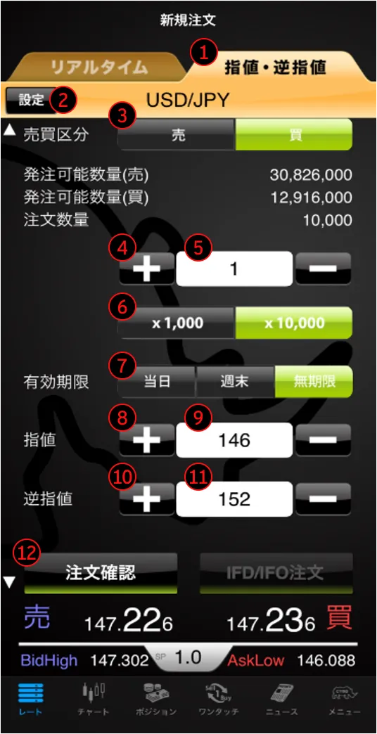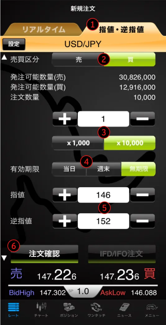 タップすると、新規指値・逆指値注文画面で入力した内容で発注します。
