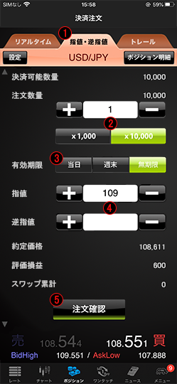 決済のリアルタイム、指値・逆指値、トレールの注文画面に遷移します。