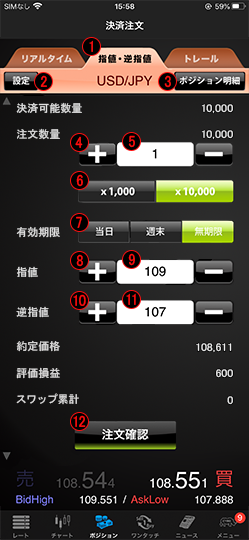 次に上の「指値・逆指値」タブをタップすると、決済の指値・逆指値注文画面が開きます。