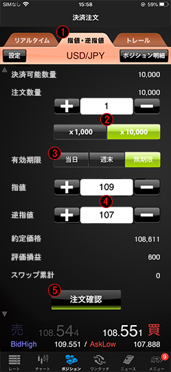 決済のリアルタイム、指値・逆指値、トレールの注文画面に遷移します。