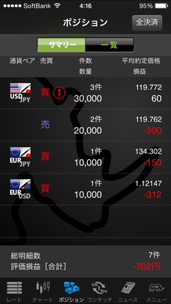まずは、下のポジションよりポジション一覧を表示し、上の「サマリー」をタップすると、ポジションサマリー画面が開きます。
