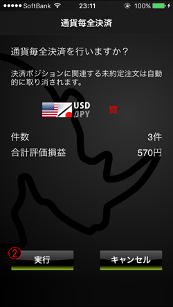 ②通貨毎全決済確認画面が表示されるので、内容を確認し、「実行」をタップします。