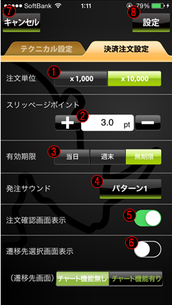 決済注文発注時のサウンドをOFFとパターン5種の中から選択できます。