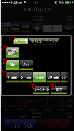 チャート設定にて選択した内容を取り消して、リアルタイム注文チャート画面へ戻ります。