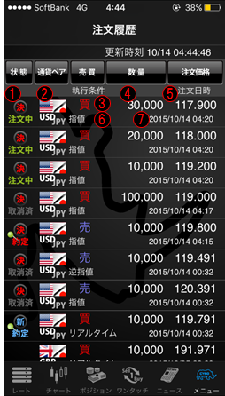 新規/決済注文の区分と、注文中/約定/取消済等の現在の注文状態です。