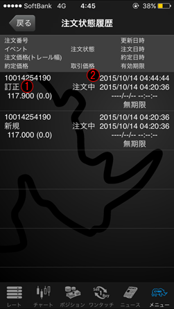 当該注文の注文、訂正、取消といった注文状態の履歴を確認できます。