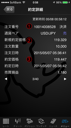 なお、約定履歴の詳細を確認したい場合は、希望の履歴をタップすると、約定詳細画面が開きます。