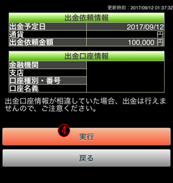 ④出金依頼確認画面が表示されたら、「実行」をタップします。