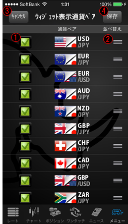 ここでは、通知センターに表示するプライスボードにおける通貨ペアの表示/非表示の設定や並び替えをすることができます。