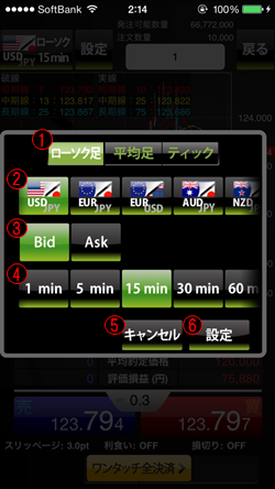 チャート設定にて選択した内容を取り消して、ワンタッチ注文チャート画面へ戻ります。