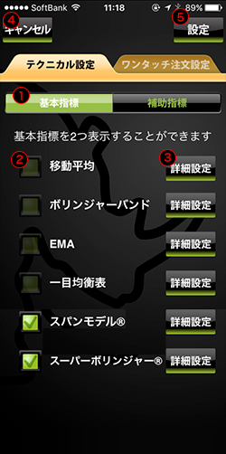 基本指標では、移動平均、ボリンジャーバンド、EMA、一目均衡表、スパンモデル®、スーパーボリンジャー®の全6種類から基本指標テクニカルを最大2つ選択することができます。