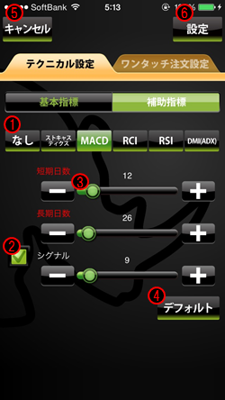 ストキャスティクス、MACD、RCI、RSI、DMI(ADX)の全5種類から補助指標テクニカルをひとつ選択することができます。