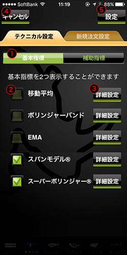基本指標では、移動平均、ボリンジャーバンド、EMA、一目均衡表、スパンモデル®、スーパーボリンジャー®の全6種類から基本指標テクニカルを最大2つ選択することができます。