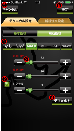 ストキャスティクス、MACD、RCI、RSI、DMI(ADX)の全5種類から補助指標テクニカルをひとつ選択することができます。