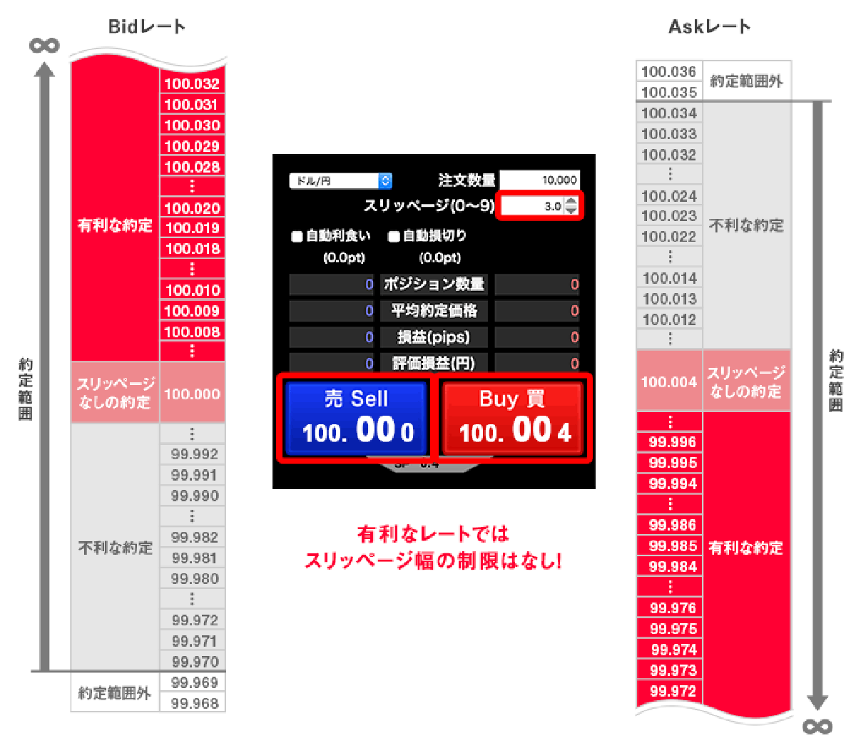このスリッページ設定機能により、発注画面の表示価格を基準として約定処理時点の配信価格がスリッページ幅の範囲内であれば約定し、範囲外であれば失効いたします。